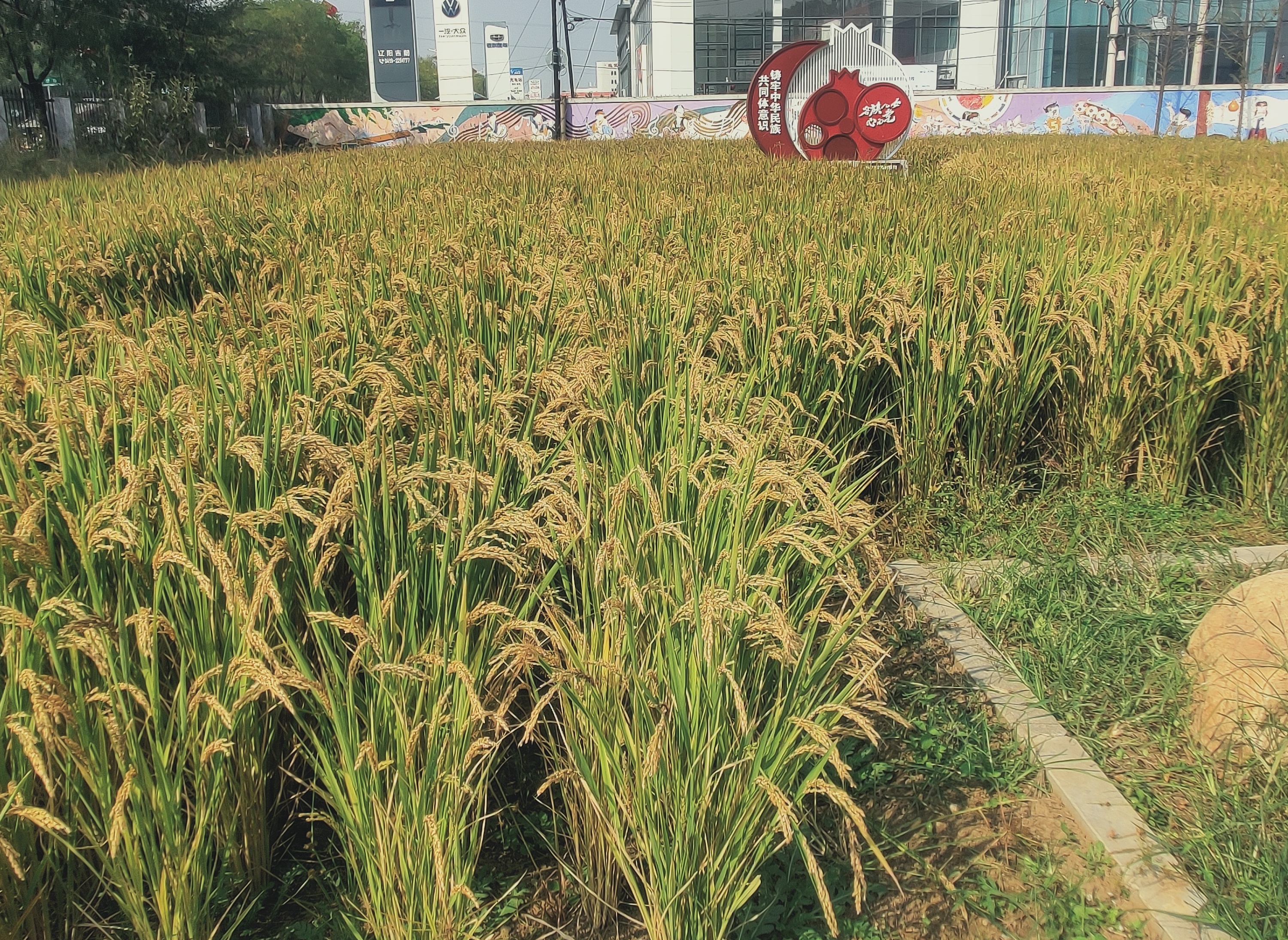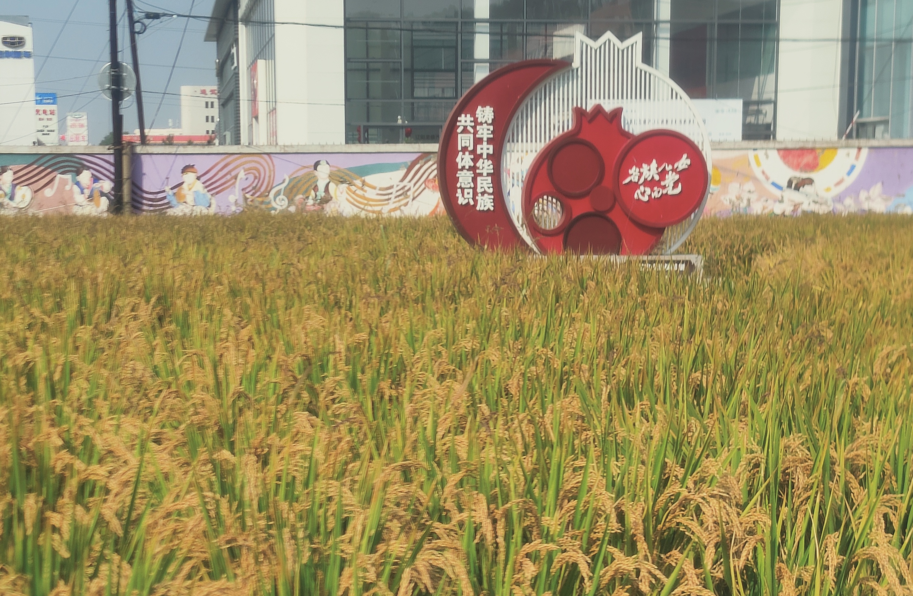료양시조선족학교 1,100여평방메터의 홍석류 농장에 가을 바람에 넘실거리는 '황금 바다'가 교정의 아름다움과 풍년의 기쁨을 드러내고 있다.