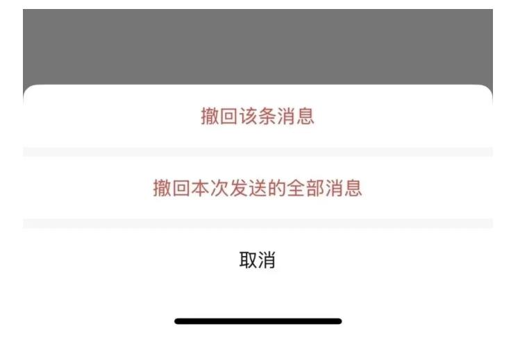 현재 위챗은 일차적으로 발송된 모든 메시지(다중선택 전송, 대량 전송된 사진, 영상과 파일 포함)를 단번에 철회할 수 있게 되였다. 예전에는 하나하나 철회해야 해서 바쁘게 움직여야 했지만 이제는 단번에 철회할 수 있어 여유롭게 대처할 수 있다.