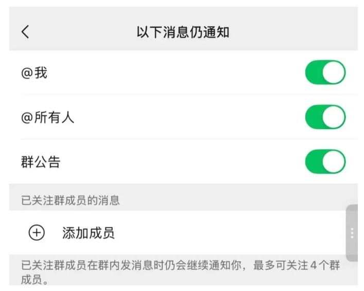 현재 위챗 단톡방 메시지는 ‘방해금지’로 설정해도 중요한 통지만 선택적으로 받을 수 있게 되였다. [단톡방 오른쪽 상단-이하 메시지 알림]을 클릭하고 ‘@나, @모든 사람, 단톡방 공지’를 선택한 후 4명의 중요한 단톡방 구성원을 추가하여 그들이 보낸 메시지알림을 받을 수 있다. 단톡방에 메시지가 란발해도 휴대폰은 진동하지 않고 보고 싶은 중요한 정보도 놓치지 않을 수 있게 되였다.