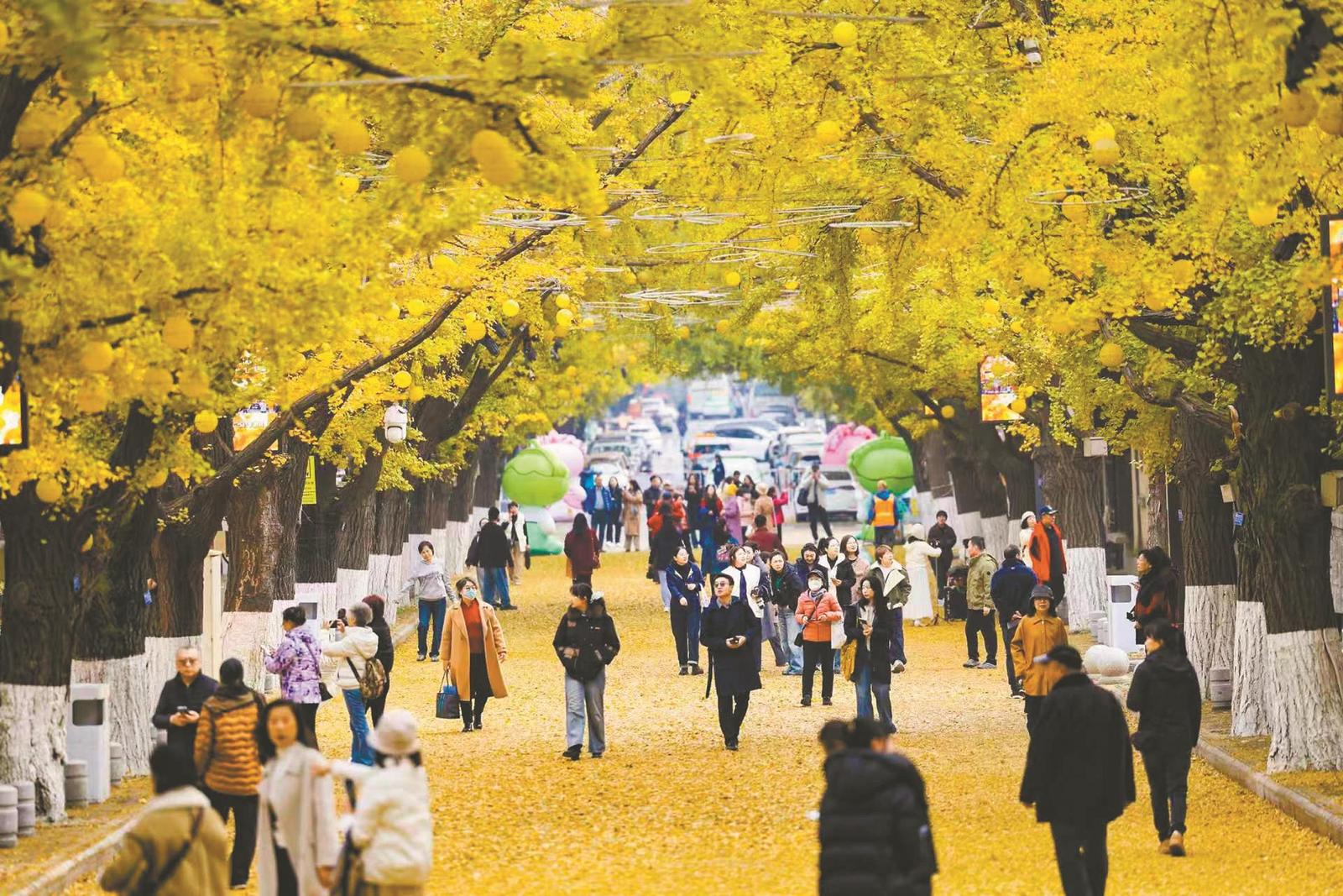 10월 29일, 단동 9위로는 노란 은행나무잎이 쌓여 '황금빛 카펫'이 펼쳐졌다.