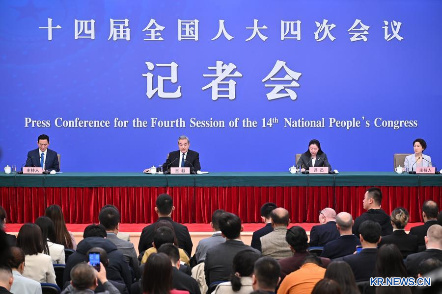 제14기 전국인민대표대회(전인대) 제4차 회의 기자회견이 8일 베이징 메이디야(梅地亞)센터 프레스룸에서 열렸다. 이날 왕이(王毅) 중국공산당 중앙정치국 위원이자 외교부장이 '중국 외교 정책과 대외 관계'와 관련해 기자의 질문에 답하고 있다. (사진/신화통신)